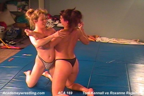 Blond Toni tackles big strong brunette Roxanne is this all out Academy war. Not overt erotic olympics here, although both women are clearly turned on by the process and action and pure competitiveness of the fight. Roxanne is stronger but Toni is quick and tough and has had enough beatings to learn what to do and how to do it so this one seesaws with multiple submissions going to each before a winner emerges. Very hot women - blond vs brunette and both very busty, very competitive and very aggressive!