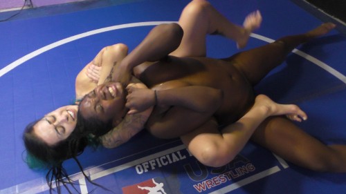 Two proud Alpha females collide, athletic, muscular bodies glistening with sweat engaged in hand to hand combat for interracial strap on supremacy. The loser will be forever humiliated, her mouth and pussy stuffed with the arrogant winner's cock. The first guillotine submission takes only 45 seconds and all it does is make the girl who submitted more determined, aggressive and tenacious as she evens things up very quickly. This fast paced affair has it all, head scissors, body scissors, triangles, arm bars, rear nakeds, facesits and more. The technical mastery is only surpassed by the hot, degrading treatment heaped on the loser as she gets her mouth fucked while suffering humiliating verbal abuse. She gets fingered to orgasm as she writhes all over the mat before getting power fucked to the floor for a second orgasm. Orgasm number three arrives as her ass gets ridden deep and hard. The sex is primal and the loser is exhausted, covered in sweat and well used.