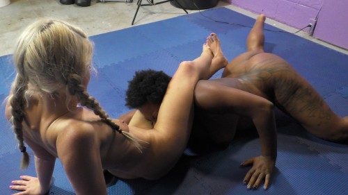 For Bunny this rematch is very personal, a matter of pride as Constance kicked her ass, made her suffer in long, grueling head scissors and facesits before fucking her silly. She feels Constance had way too much fun at her expense and that things will be very different. Bunny is more aggressive, fierce and mean and immediately tries sitting on the smaller girl's face, gets reversed and submitted but keeps fighting like a hell cat. She puts her foe under tits and ass but gets trapped in an insane headlock and head scissor combo, This one's gonna be a classic with intense grappling by both nude warriors, covered in sweat and willing to do anything to win. There was some surprise hair pulling, nipple twisting and ass slapping. There is a scary rear naked that leaves Bunny whimpering, moaning and groaning as she tries her best to hold out because she doesn't want to be humiliated and fucked again. Bunny has to wipe her mouth after Constance facesits her with a super wet pussy as the combat has her aroused beyond belief. The better woman wastes no time in claiming her prize, roughly using the loser as fuck meat. Slapping her ass and riding her thickness to multiple orgasms for daring to challenge her and give her a fight better than the first one. She twists her nipples and pulls her hair before making her ride her cock to ecstasy. The loser submissively kisses the victor, worships her tits and cleans off her cock for good measure.