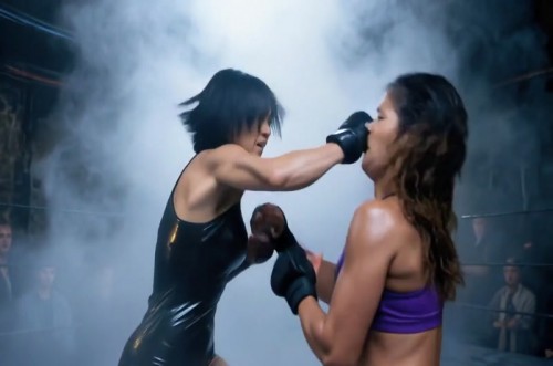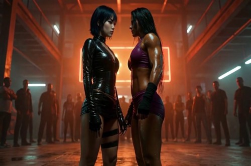 Welcome to the world's premier underground female fight club. You don't stumble into this place, you get invited or you don't get in at all. Out there fights are illegal but in here they are the main event. No cameras, no rules—just pain, pride and a lot of bad decisions. Nobody steps into this ring by accident. Super-sexy Eva Black challenges muscular California beauty Luna Serrano to a fight that's personal with Eva claiming she can smell her girlfriend's scent on her enemy. They attack with face punches, head kicks, elbows and leg locks. A fantasy sequence allows that if they weren't so intent on kicking each other's ass, they would take it to the bedroom as the sexual tension and energy are palpable. They trade punches back and forth with no mercy then take it to the ground with vicious headlocks and pins until the loser is lifted then slammed viciously to the mats. The winner mounts her rival with a schoolgirl pin then pummels her with crushing shots to the head leaving her out cold. The victor returns to her corner to reclaim her girlfriend after 7 minutes of intense underground fighting action at The Sirens Den.